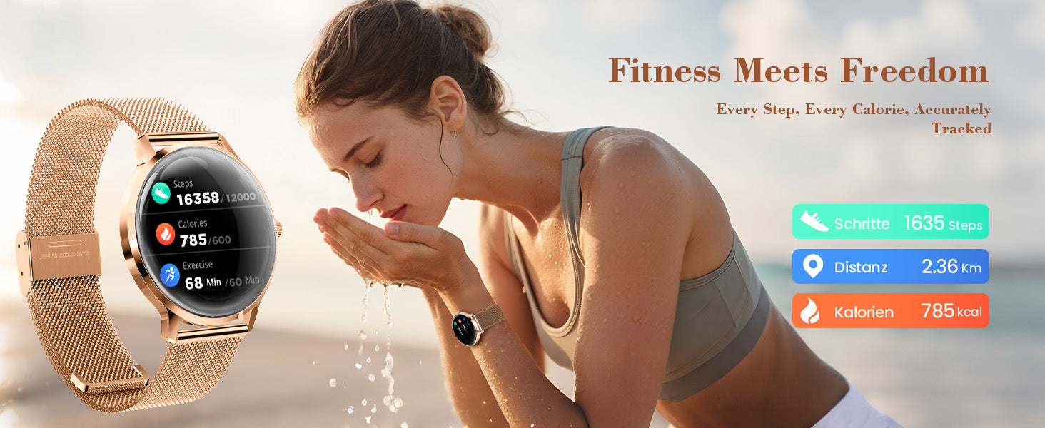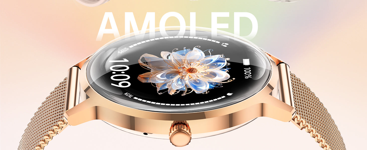 Enjoy a bright, smooth display with the high-resolution AMOLED screen (466×466), clearly visible even in direct sunlight. With its Always-On function and scratch-resistant glass, this round women’s smartwatch is built to last and stay stylish at all times.