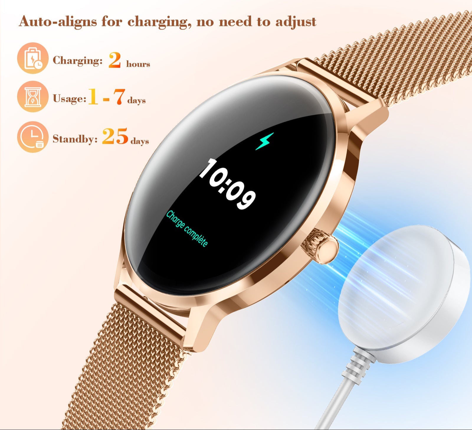 Thanks to magnetic charging, this women’s health smartwatch fully charges in just 2 hours and lasts up to 7 days. Just place it gently on the magnetic charger — it aligns automatically thanks to the built-in magnet. Perfect for travel, busy weeks, or worry-free continuous use.