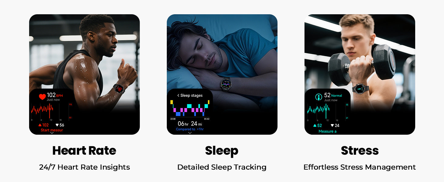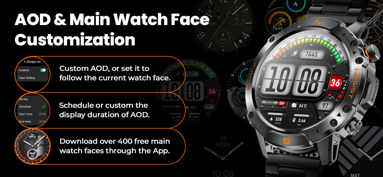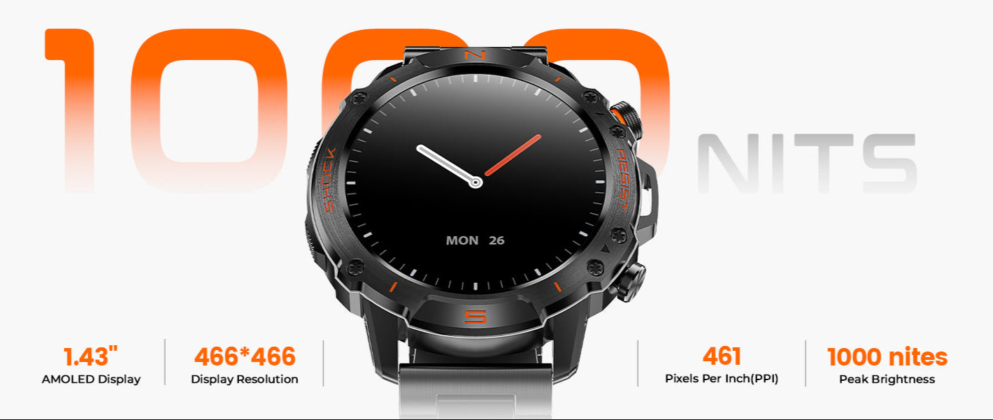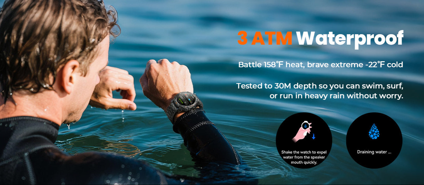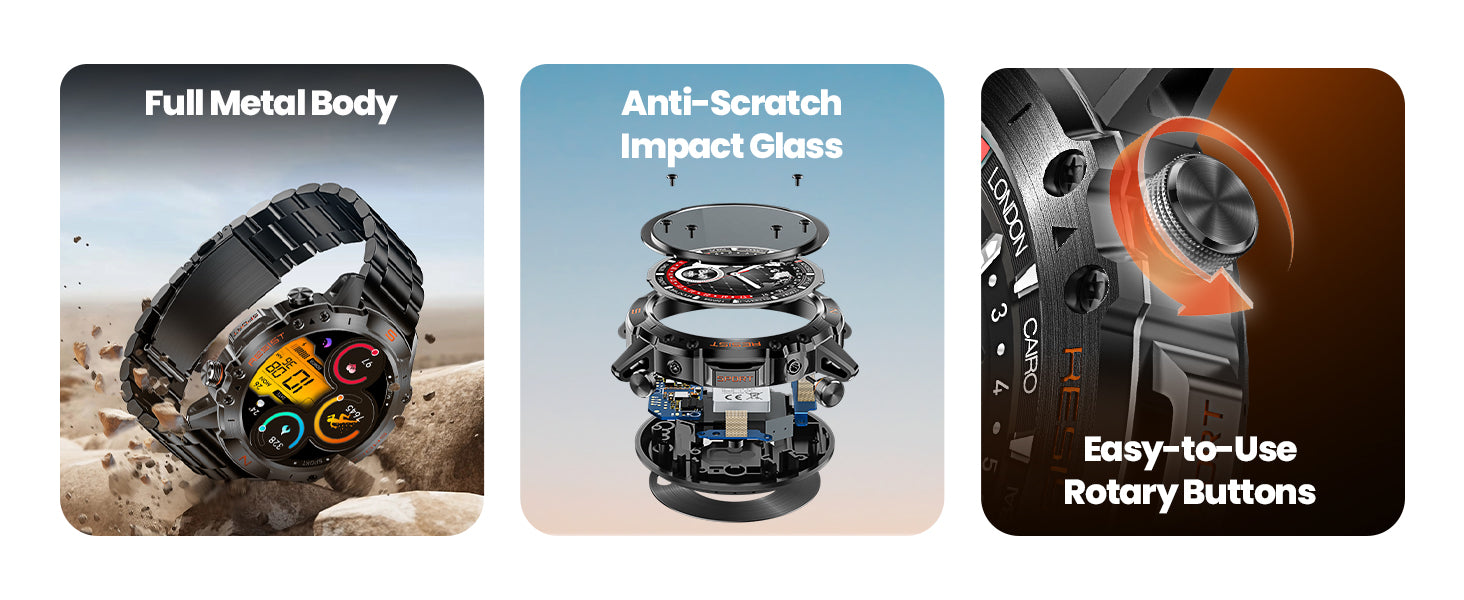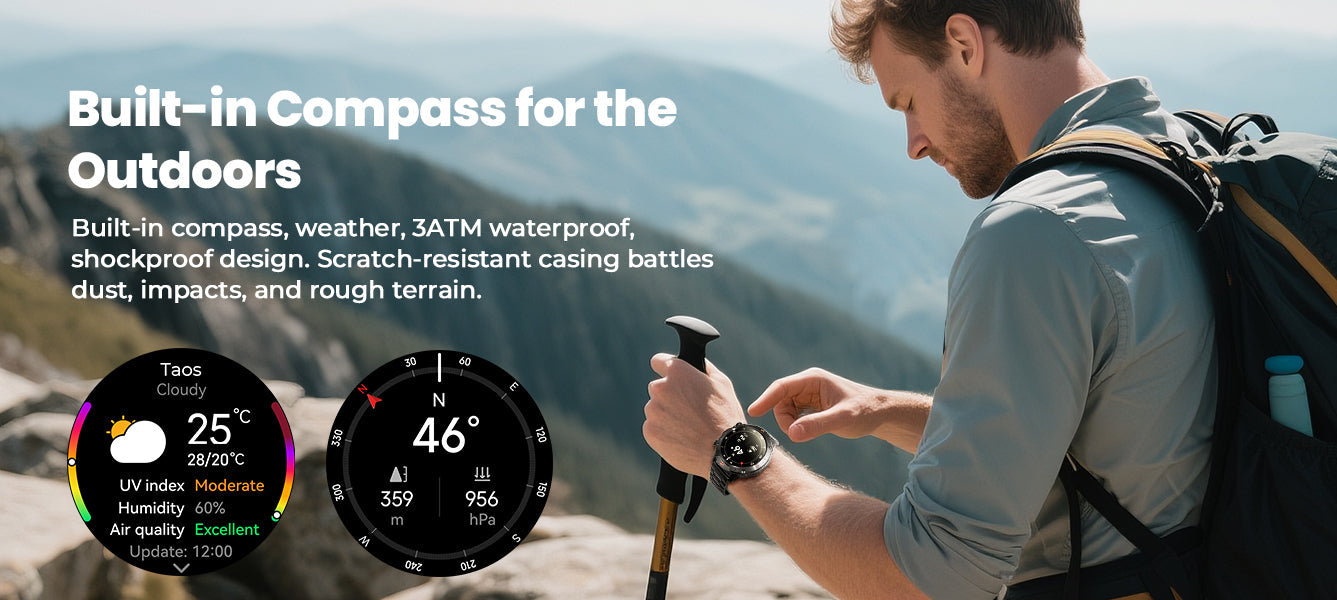 - 【Built-in Compass for the Outdoors】Conquer the harshest terrain with this rugged smart watch made for climbers, runners, and adventurers. Built with compass, 3ATM water resistance, anti-drop construction, and a scratch-resistant case, it endures dust, impact, and rocky scrapes during hikes and climbs.