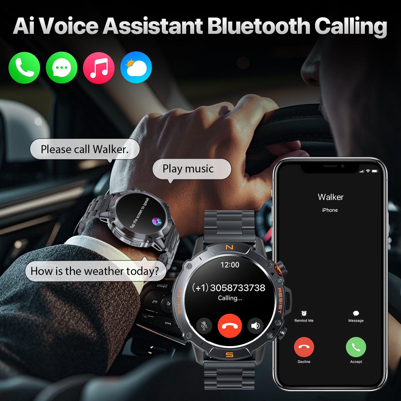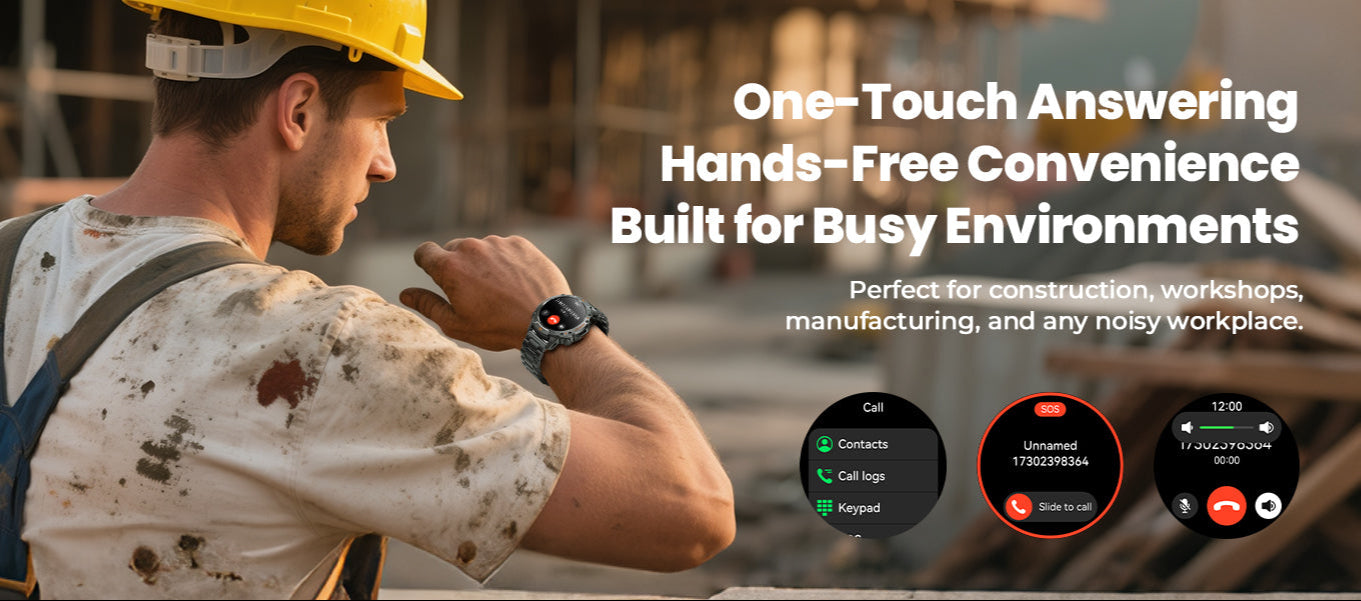 - 【Hands-Free Calling on Site】On loud job sites where your hands are busy and your phone is out of reach, this android smart watch for iphone compatible becomes your lifeline. With a built-in high-volume speaker and stable Bluetooth connection, you can answer and make calls directly from your wrist—no need to stop working or search for your phone, for construction workers