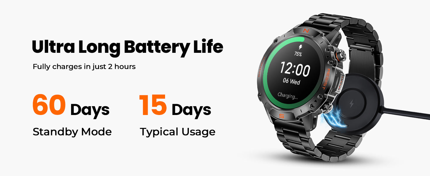 - 【60-Day+ Sustained Power】Engineered for endurance, this smart watches for men delivers 60-day standby power and 15-day continuous operation. The advanced magnetic charging system achieves full power in 2 hours, maintaining reliable performance during extended workouts or outdoor excursions.