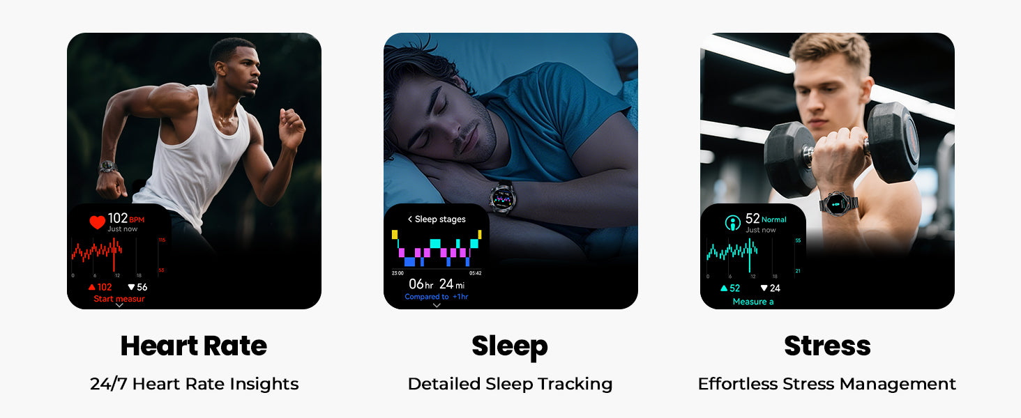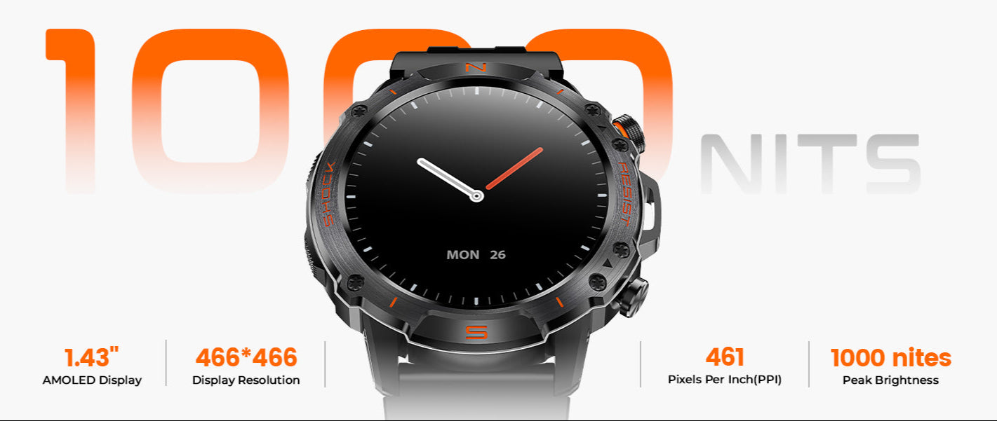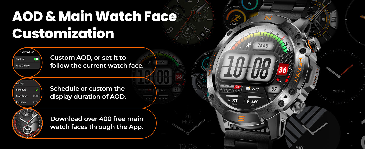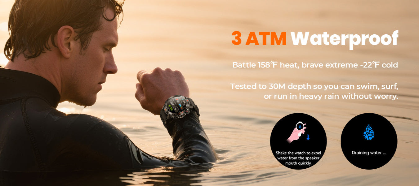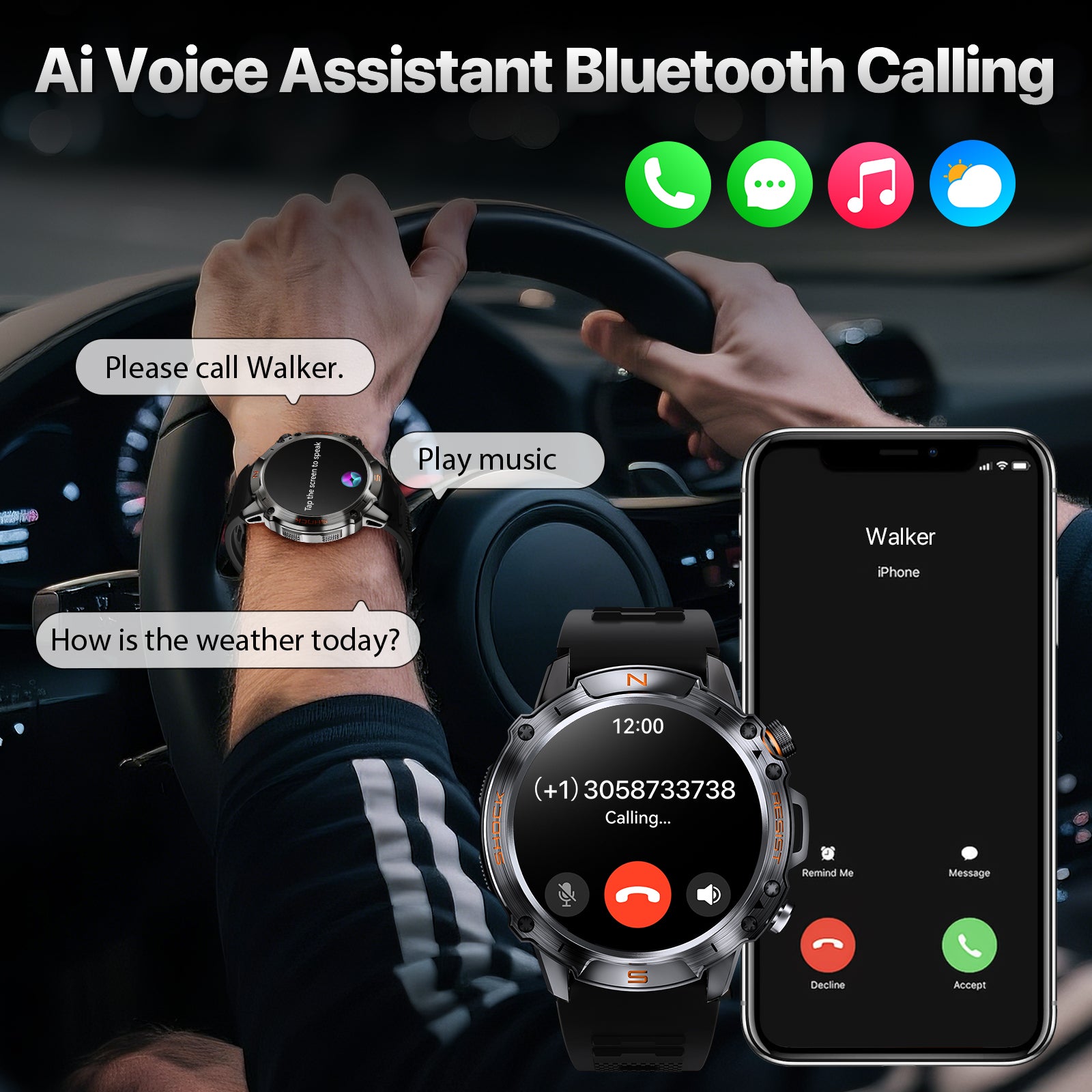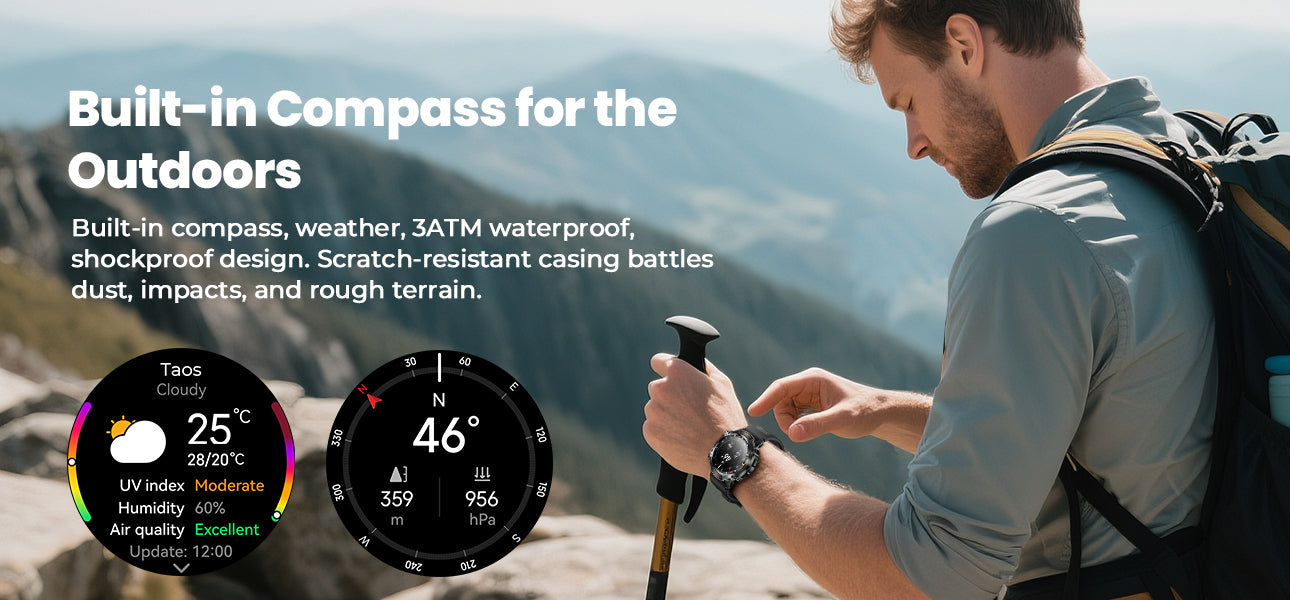 - 【Built-in Compass for the Outdoors】Conquer the harshest terrain with this rugged smart watch made for climbers, runners, and adventurers. Built with compass, 3ATM water resistance, anti-drop construction, and a scratch-resistant case, it endures dust, impact, and rocky scrapes during hikes and climbs.