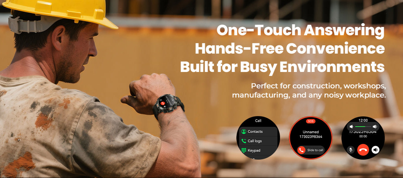 - 【Hands-Free Calling on Site】On loud job sites where your hands are busy and your phone is out of reach, this android smart watch for iphone compatible becomes your lifeline. With a built-in high-volume speaker and stable Bluetooth connection, you can answer and make calls directly from your wrist—no need to stop working or search for your phone, for construction workers