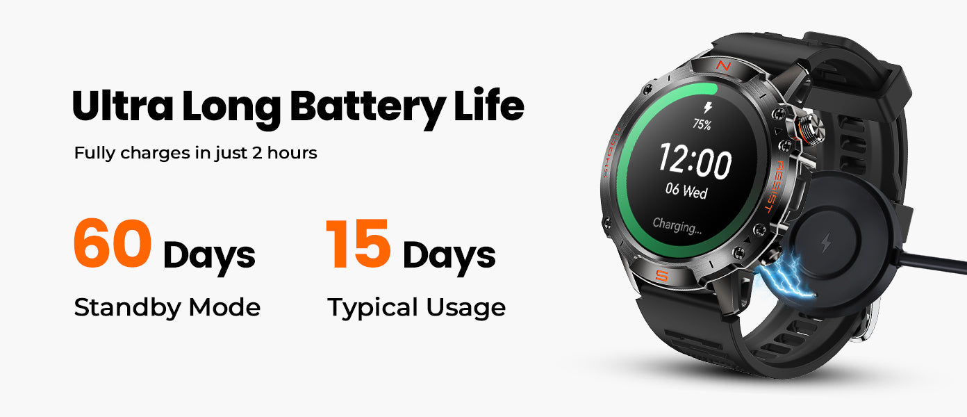 - 【60-Day+ Sustained Power】Engineered for endurance, this smart watches for men delivers 60-day standby power and 15-day continuous operation. The advanced magnetic charging system achieves full power in 2 hours, maintaining reliable performance during extended workouts or outdoor excursions.